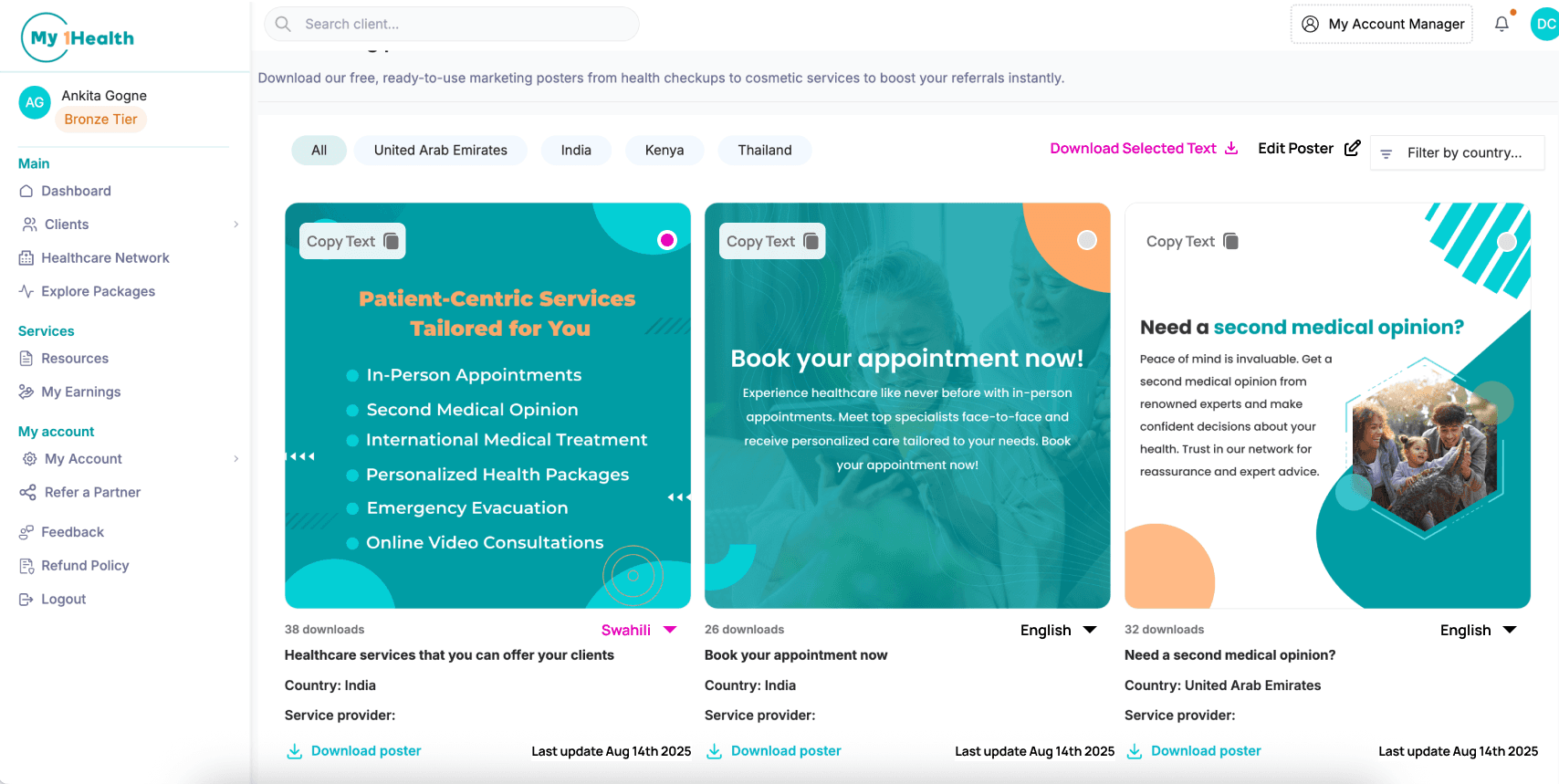Agents are currently using marketing materials from the My 1 Health portal to promote services on their own platforms. These materials are provided in JPEG format and only in English.