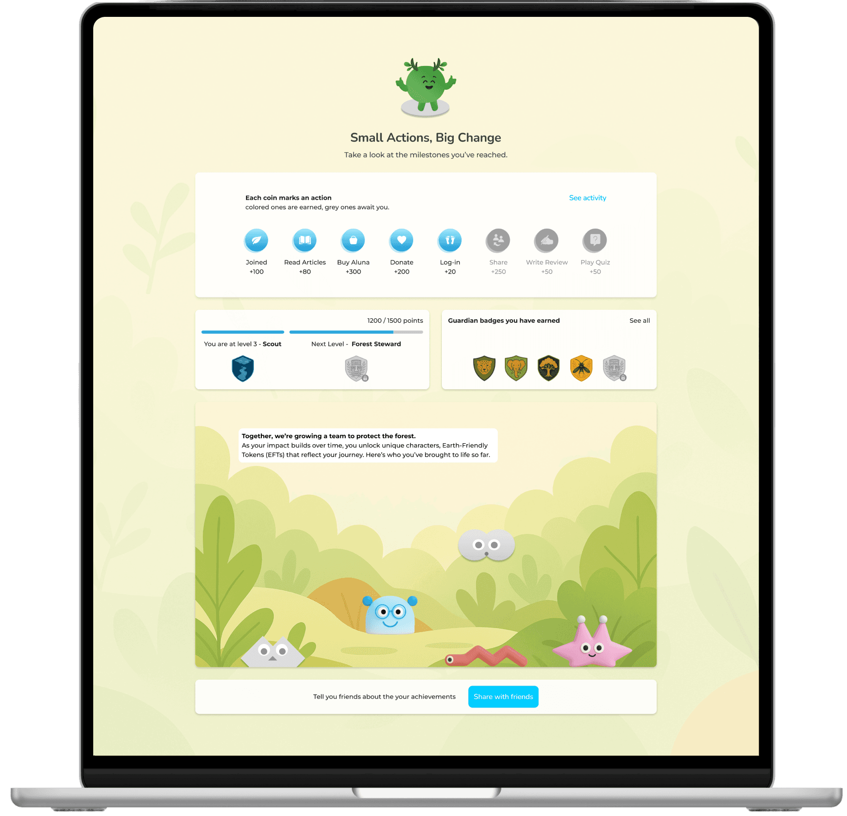 An interactive dashboard that makes earth conservation impact visible and motivates ongoing participation through gamification, progress tracking, and education.